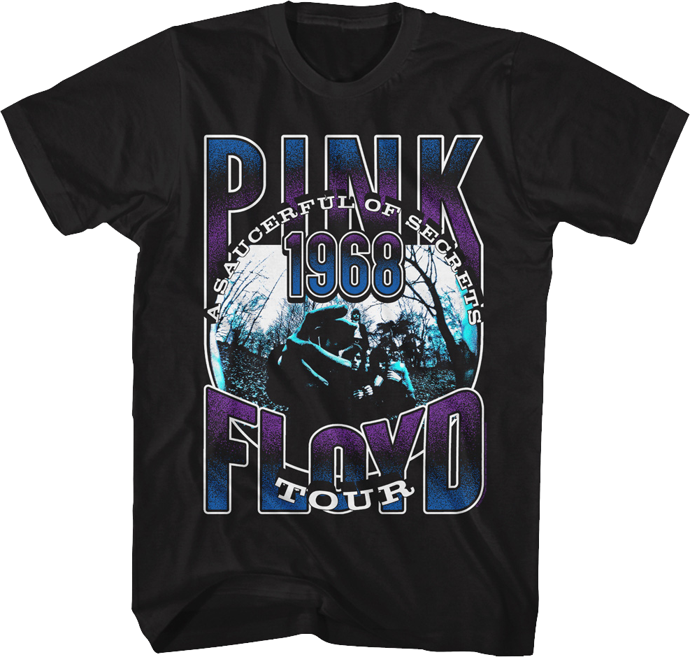 In 1968, Pink Floyd released their second album, A Saucerful of Secrets. The band brought in David Gilmour and began to map out the dark and repetitive pulses that would characterize their next few records. Pink Floyd went on tour to support the album with a set list that included "Let There Be More Light", "Corporal Clegg" and "Remember A Day". Everyone will know you are a fan of the classic album A Saucerful of Secrets when you wear this 1968 Tour Pink Floyd T-Shirt!