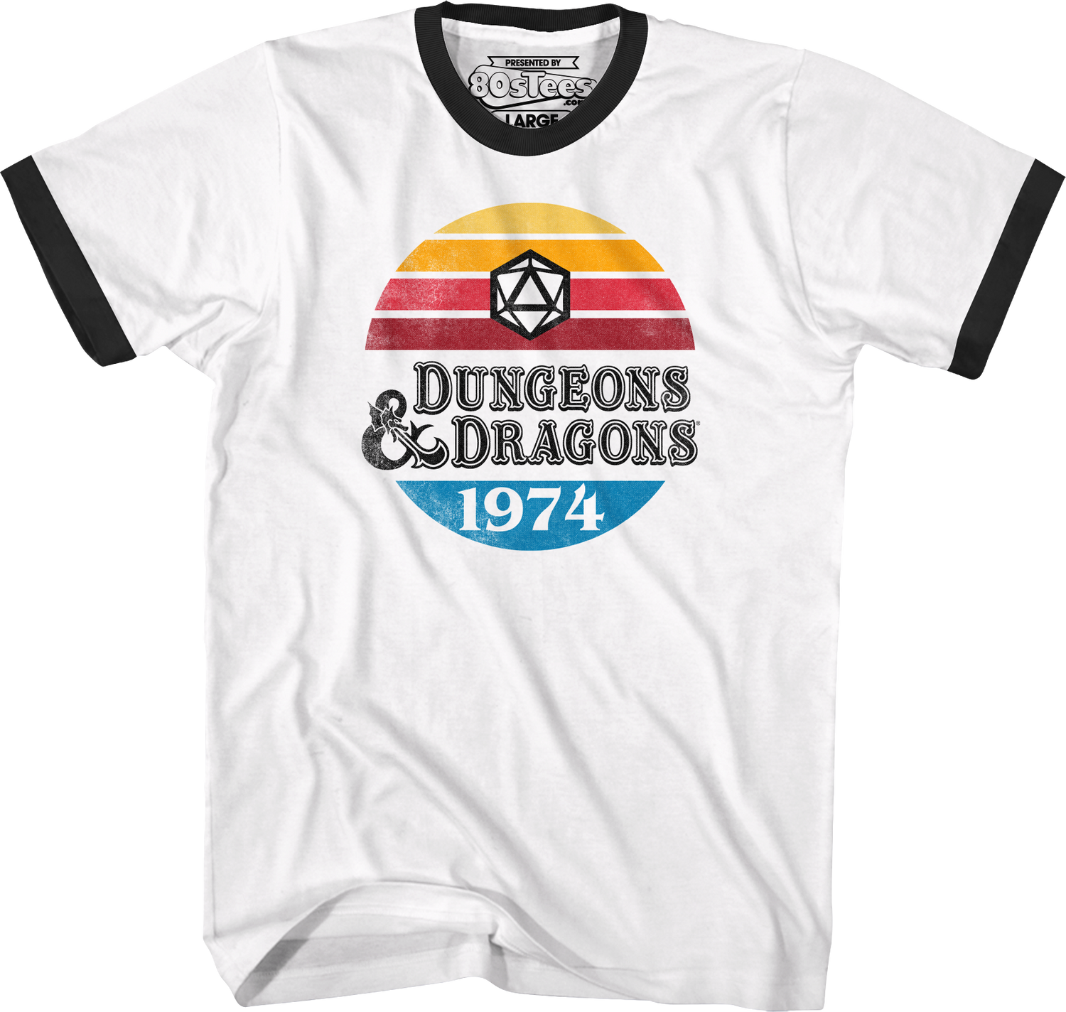 The original Dungeons & Dragons fantasy role-playing game boxed set was published in 1974, and introduced concepts which would become standard in later editions. These included abilities, character classes, and levels. The set also included rules for wilderness travel by land and sea, hiring specialists and men-at-arms, building fortifications and setting up baronies. These are the rules that would carry on to later editions and continue the tradition of the greatest role-playing game of all time. Everyone will immediately know you are a fan when you wear this 80sTees.com exclusive 1974 Dungeons & Dragons Ringer Shirt!