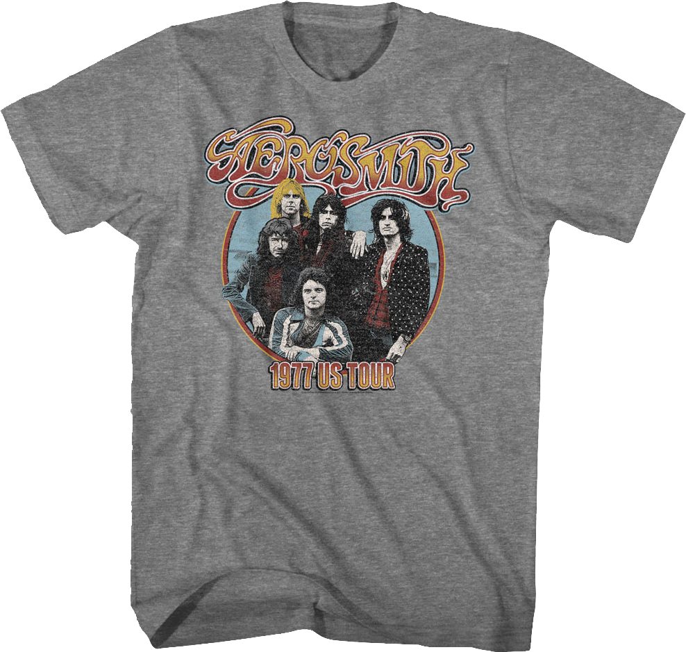 This Aerosmith t-shirt show band members Joey Kramer, Tom Hamilton, Brad Whitford, Steven Tyler, and Joe Perry in a photo promoting their 1977 US Tour.