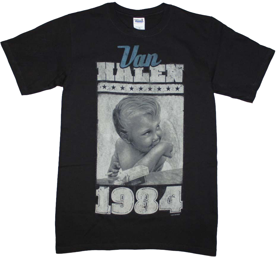 This Van Halen t-shirt features a sketch of the cover artwork for the band's sixth studio album 1984. The artwork shows a winged child smoking a cigarette.