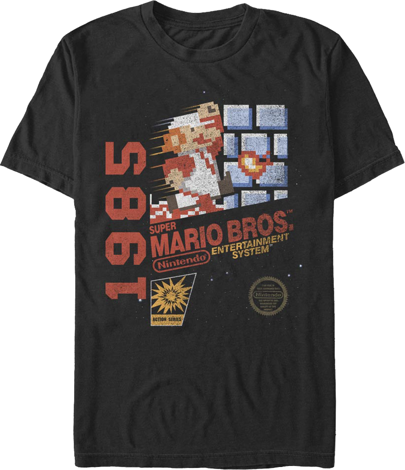 Super Mario Bros. received critical acclaim and is considered one of the best games of all time. Everyone will know you are a fan when you wear this 1985 Cartridge Art Super Mario Bros. T-Shirt!