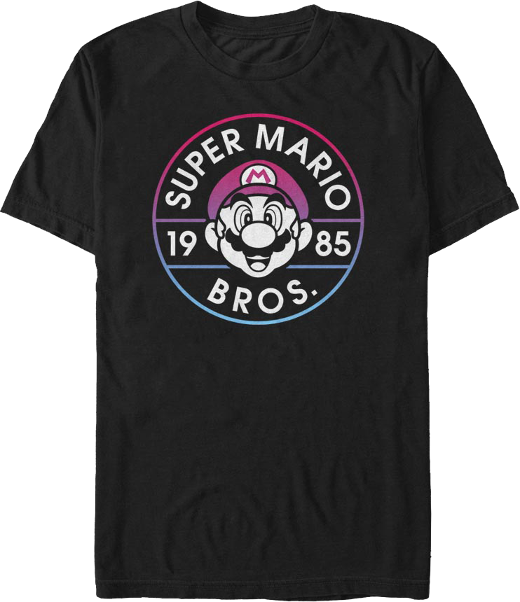 This Super Mario Bros. t-shirt shows the mustached plumber Mario's face in a neon circle. The shirt reads Super Mario Bros. 1985.