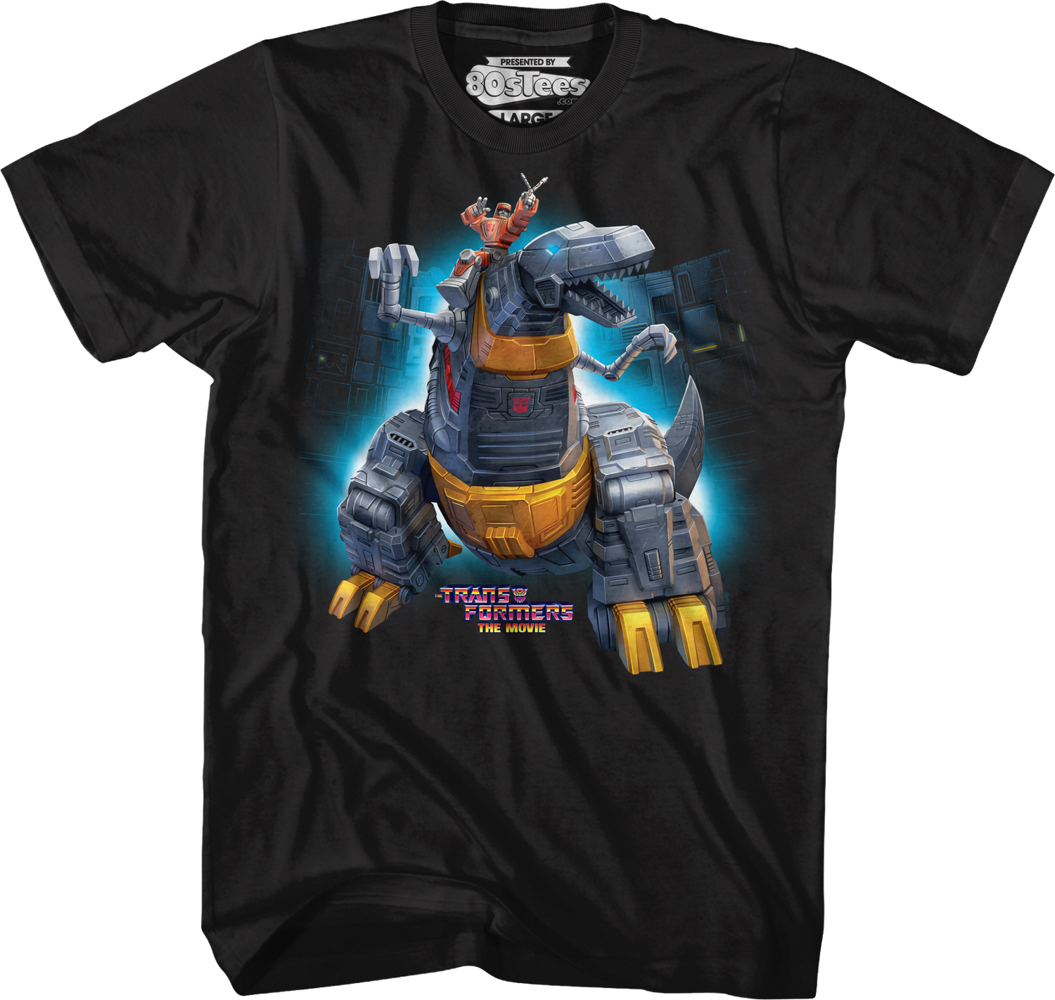 For any fan of the leader of the Dinobots, this 80sTees.com exclusive 1986 Grimlock Transformers T-Shirt is a must have!