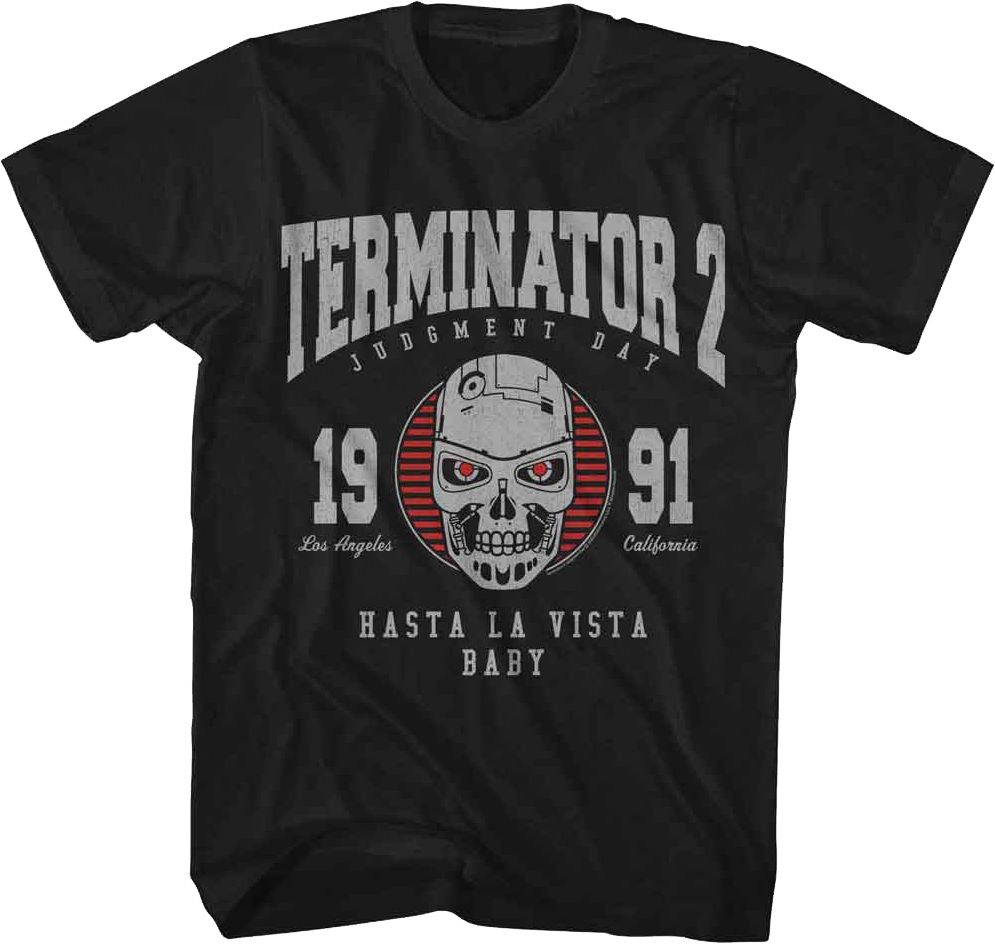 Everyone will know you are a fan of James Cameron's action-packed classic starring Arnold Schwarzenegger when you wear this 1991 Collegiate Logo Terminator 2 Judgment Day T-Shirt!