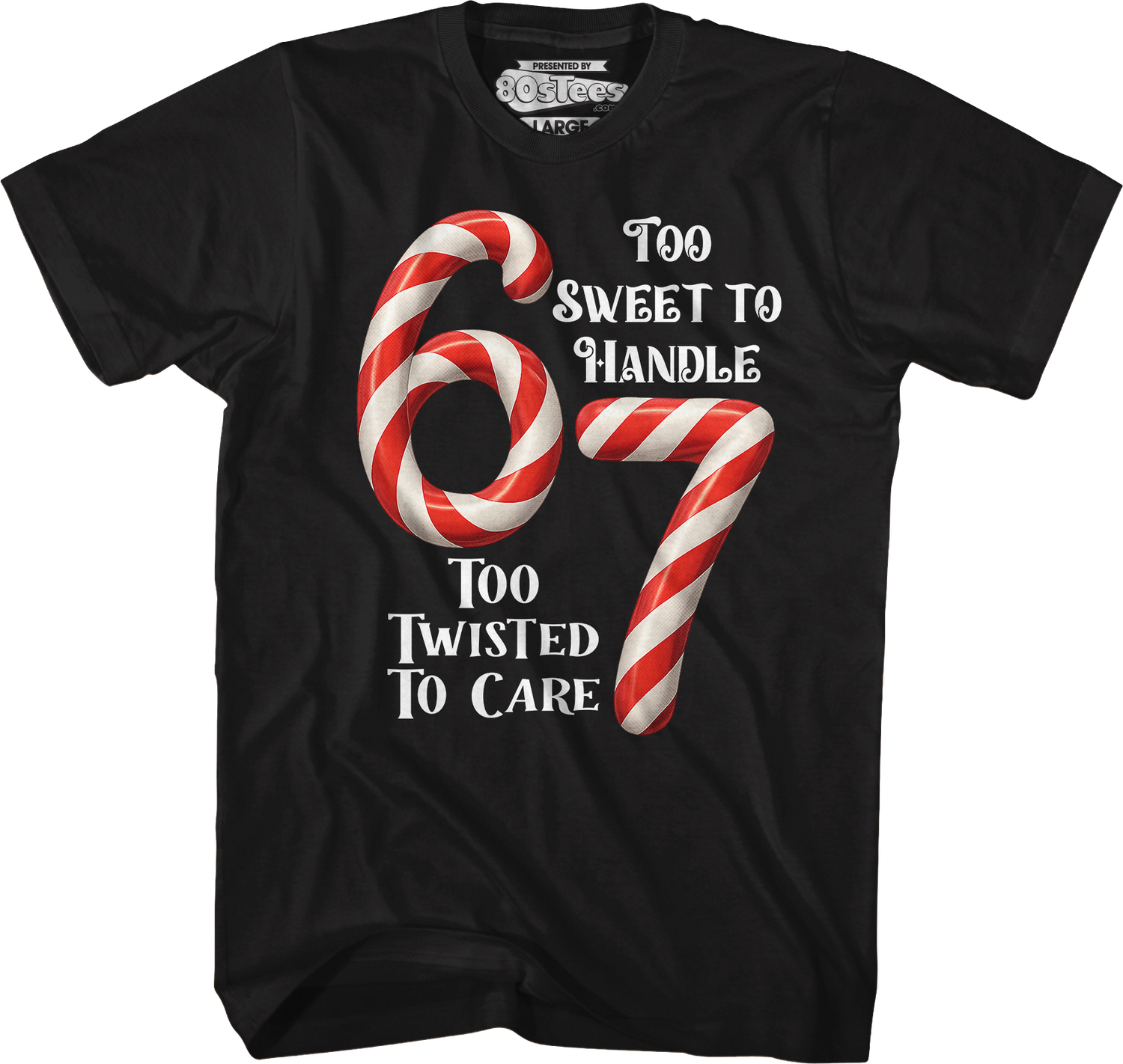 This 80sTees.com exclusive t-shirt shows candy canes shaped like the numbers 67. The shirt reads Too Sweet To Handle Too Twisted To Care.