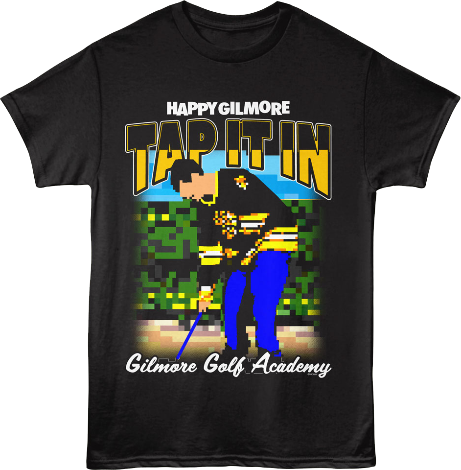 This Happy Gilmore t-shirt feature an 8-bit image of Happy from the video game Gilmore Golf Academy. The shirt reads Tap It In.