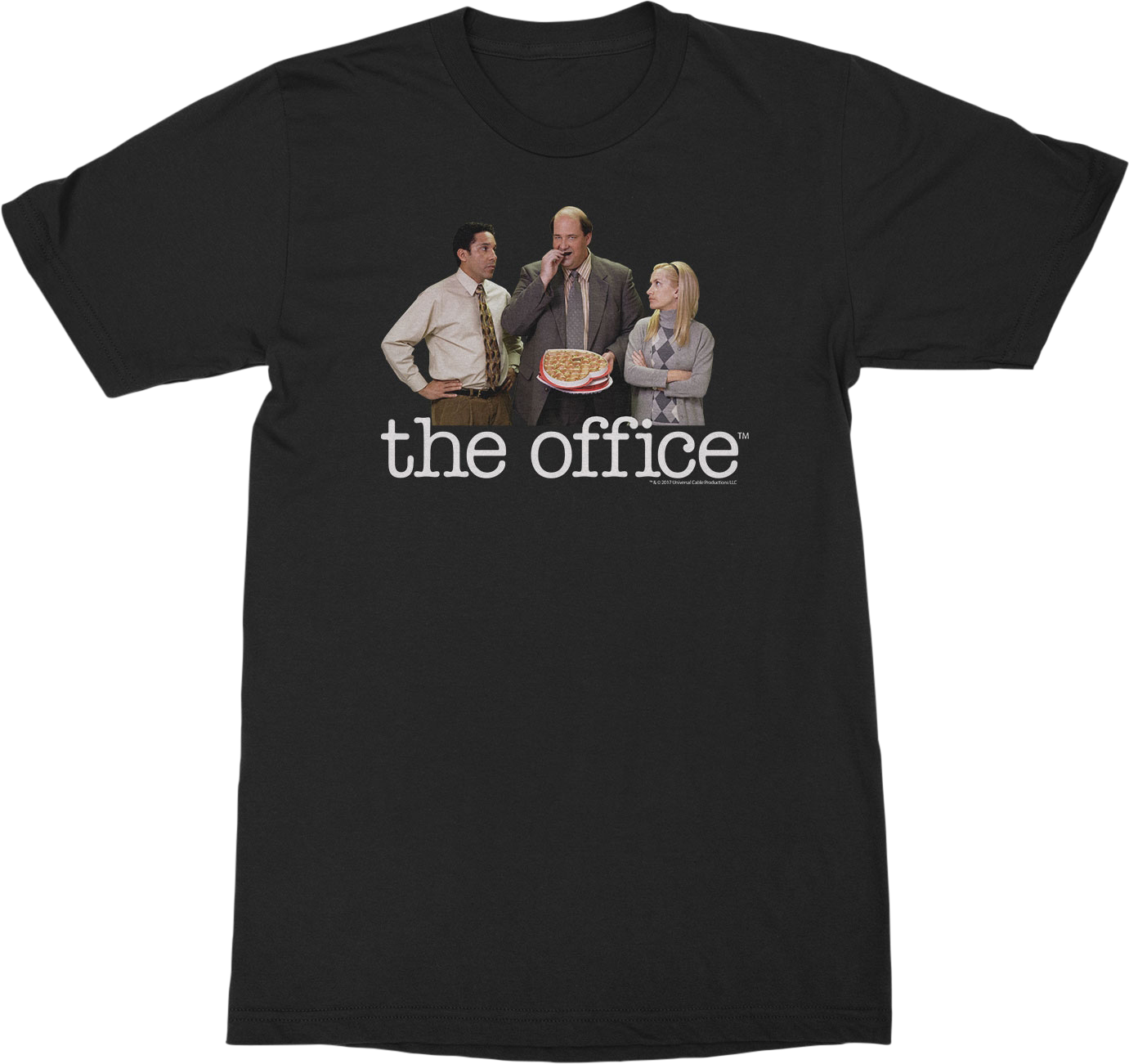 This Office t-shirt features an image of the accounting team for Dunder Mifflin's Scranton branch. The shirt shows The Finer Things Club member Oscar Martinez; the gold medal winner for fitting the most M&Ms in his mouth, Kevin Malone; and the stern head accountant, Angela Martin.