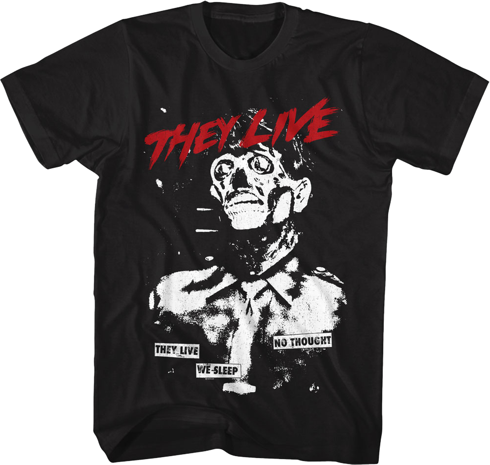 Everyone will immediately know you are a fan of John Carpenter's 1988 sci-fi classic starring "Rowdy" Roddy Piper when you wear this Achromatic No Thought They Live T-Shirt!