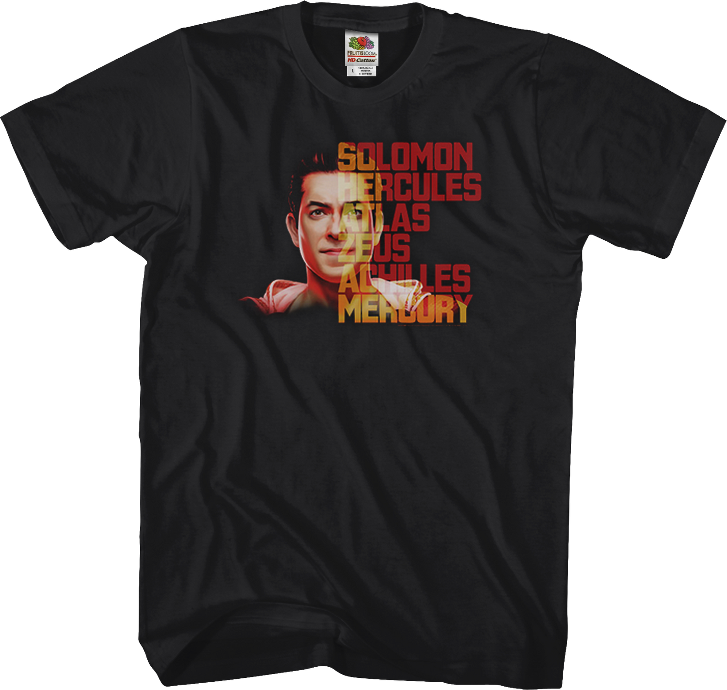 This Shazam t-shirt features an image of the superhero and the names of the legendary figures: S - for the wisdom of Solomon, H - for the strength of Hercules, A - for the stamina of Atlas, Z - for the power of Zeus, A - for the courage of Achilles, M - for the speed of Mercury.