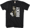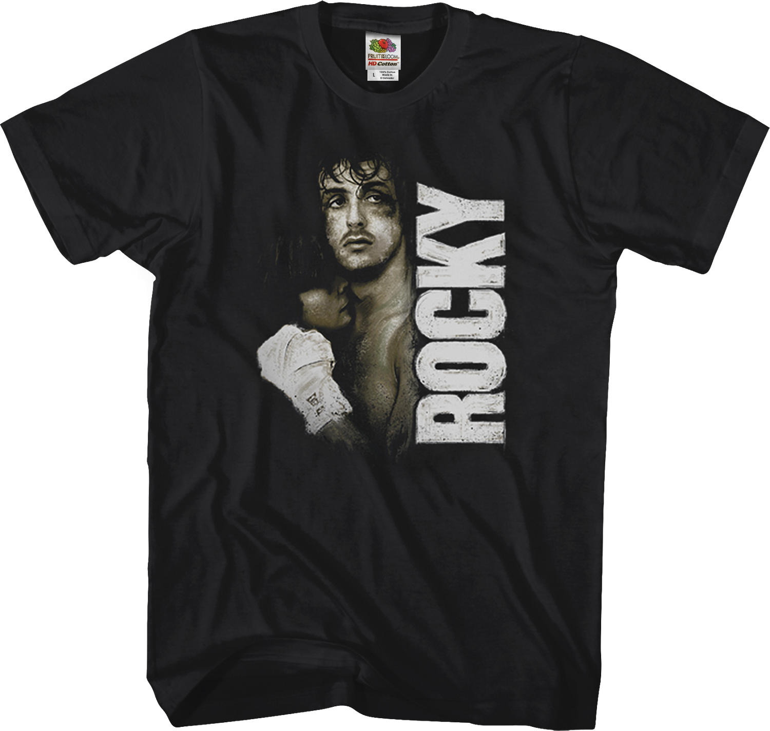 This Adrian and Rocky T-Shirt shows a painted image of the couple together after a boxing match. The characters are shown in black and white with Rocky's hands taped and his name in block letters. Sylvester Stallone and Talia Shire portrayed one of the audiences' favorite couples from their first awkward encounter, through their hardships, and until his heartwarming trips to her grave.