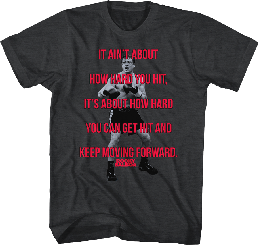 This Rocky t-shirt features an image of The Italian Stallion preparing to battle Mason "The Line" Dixon in the 2006 movie Rocky Balboa. The shirt includes the quote "It ain't about how hard you hit, It's about how hard you can get hit and keep moving forward". This quote was delivered by Sylvester Stallone in Rocky Balboa. Show that your love for the Rocky franchise keeps moving forward with this Ain't How Hard You Hit Rocky t-shirt.