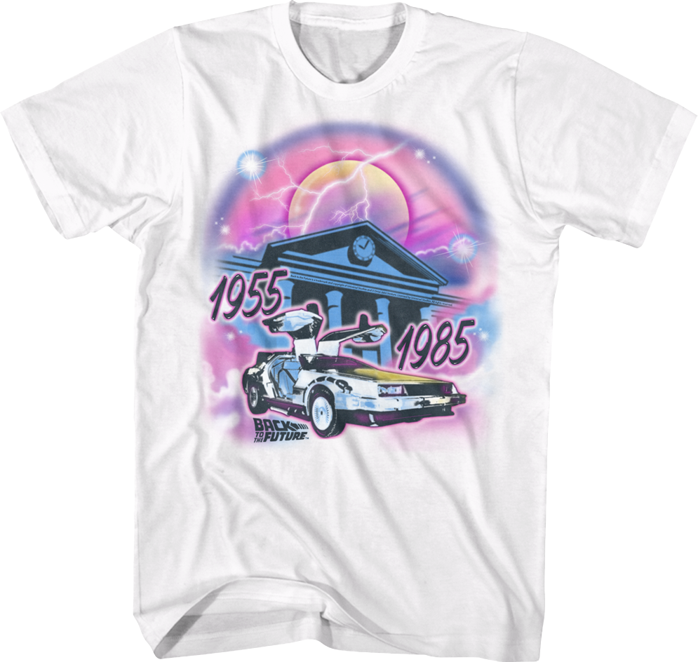 This Back To The Future t-shirt shows an airbrushed image of Doc Brown's DeLorean parked in front of the Hill Valley Courthouse and clock tower. The shirt shows the years 1955 and 1985.
