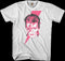 This Aladdin Sane David Bowie T-Shirt features the cover image from the 1973 album, Aladdin Sane. The artist's lightning face paint is repeated in the background of the shirt. The album's title is a pun on "A Lad Insane" and the track list for his sixth album includes the hits "The Jean Genie" and "Drive-In Saturday".