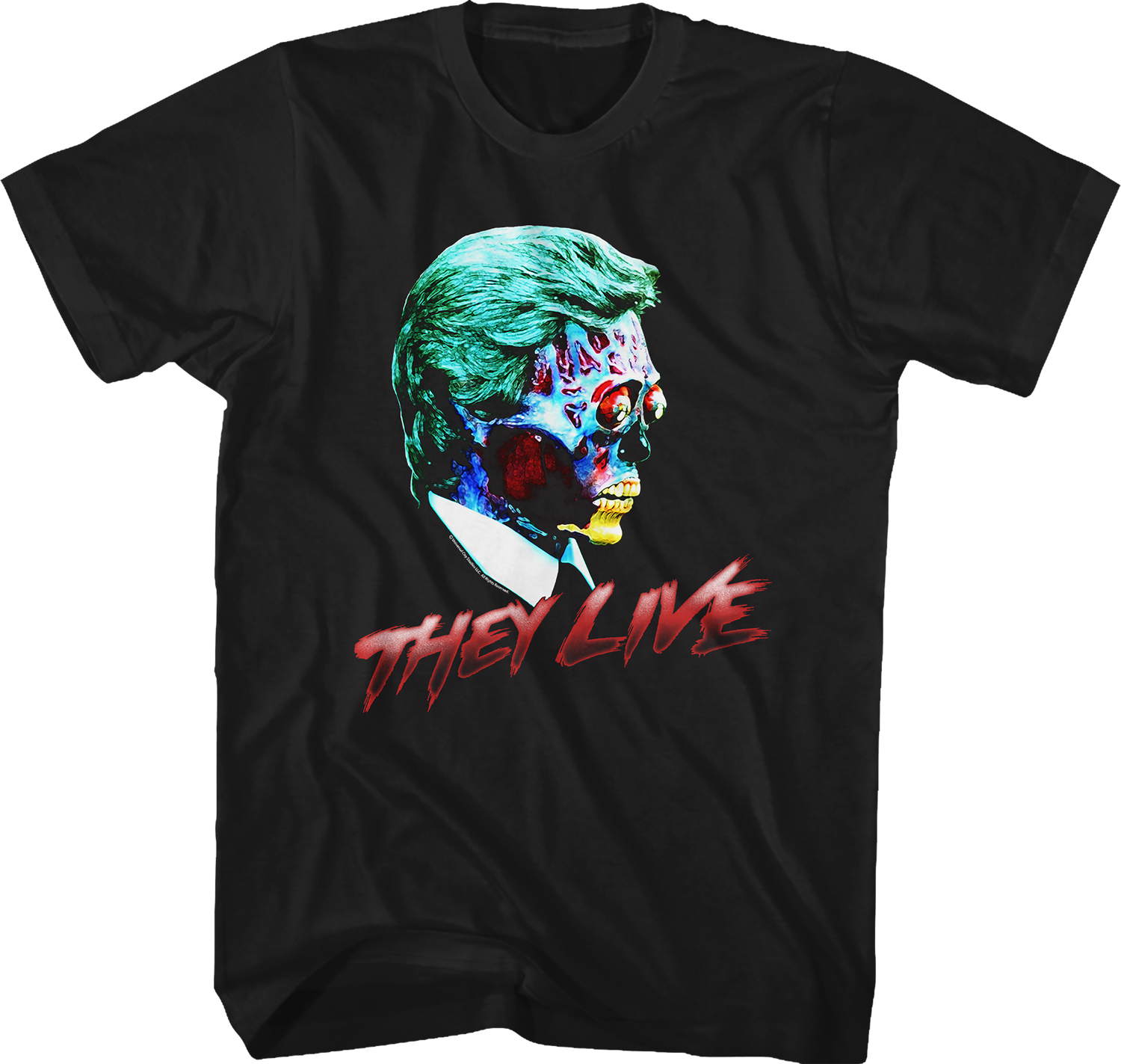 For any fan of John Carpenter's sci-fi classic starring "Rowdy" Roddy Piper, this Alien Head Shot They Live T-Shirt is a must have!