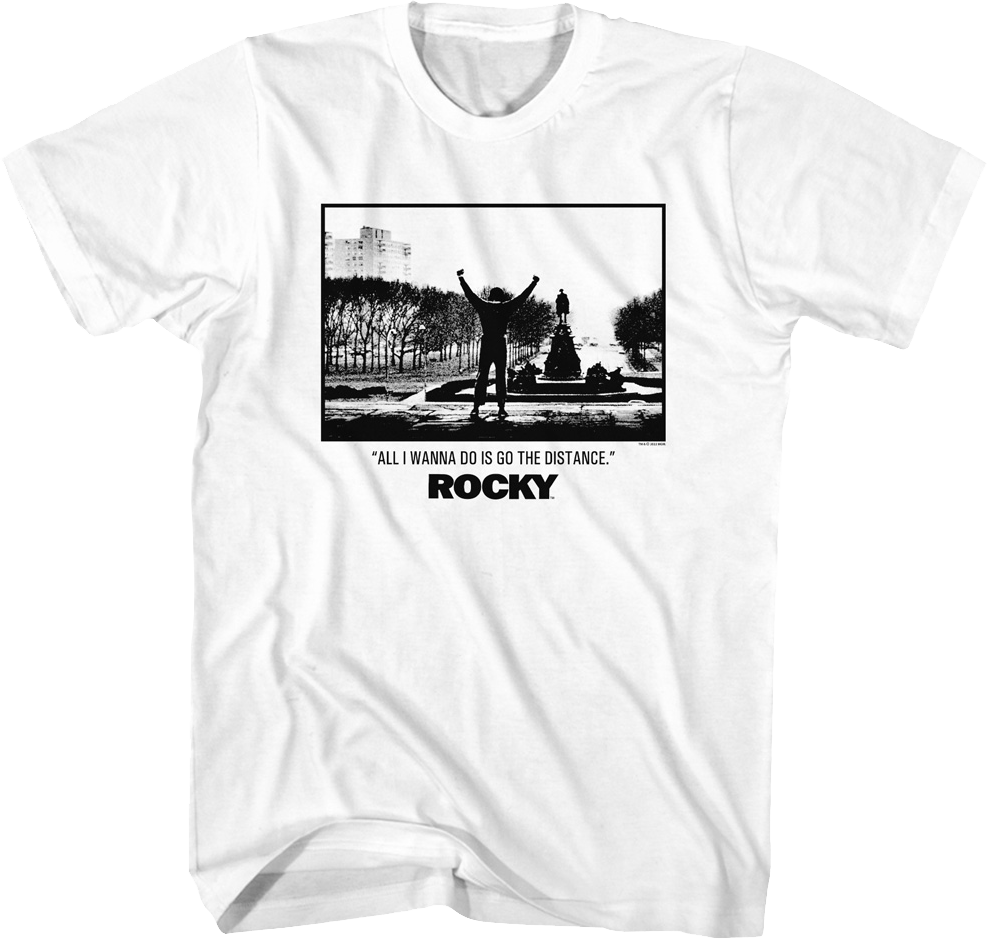 This Rocky t-shirt shows Rocky Balboa in a victory pose at the top of the stairs at the Philadelphia Museum of Art. The shirt includes Rocky's quote, "All I wanna do is go the distance".