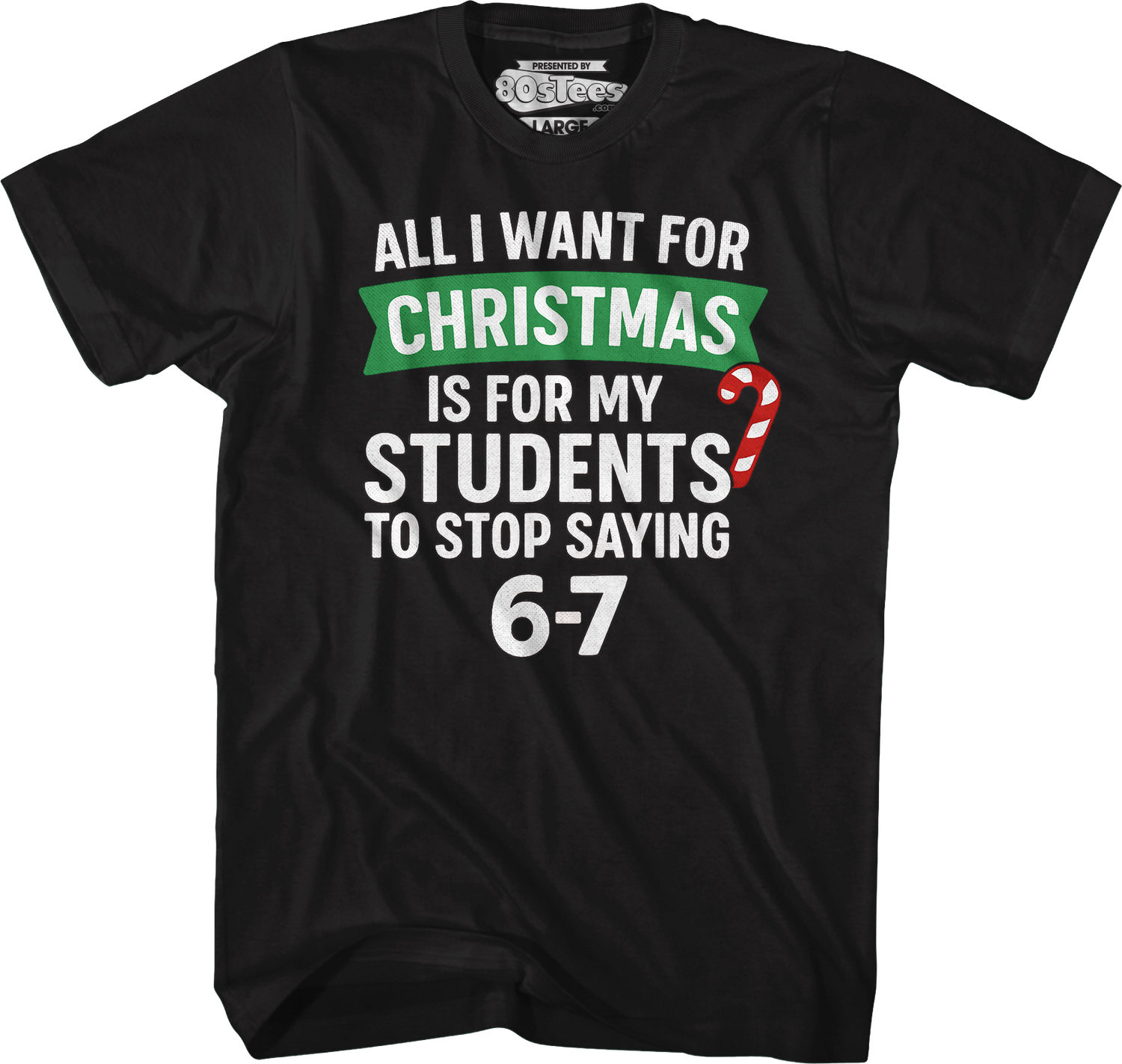 Teachers are surrounded by students constantly saying "6-7", a phrase that means absolutely nothing. The more the students say the phrase, the more annoying it gets. Let everyone know that this frustration makes the holiday season a little less holly jolly when you wear this 80sTees.com exclusive All I Want For Christmas Is For My Students To Stop Saying 6-7 T-Shirt!