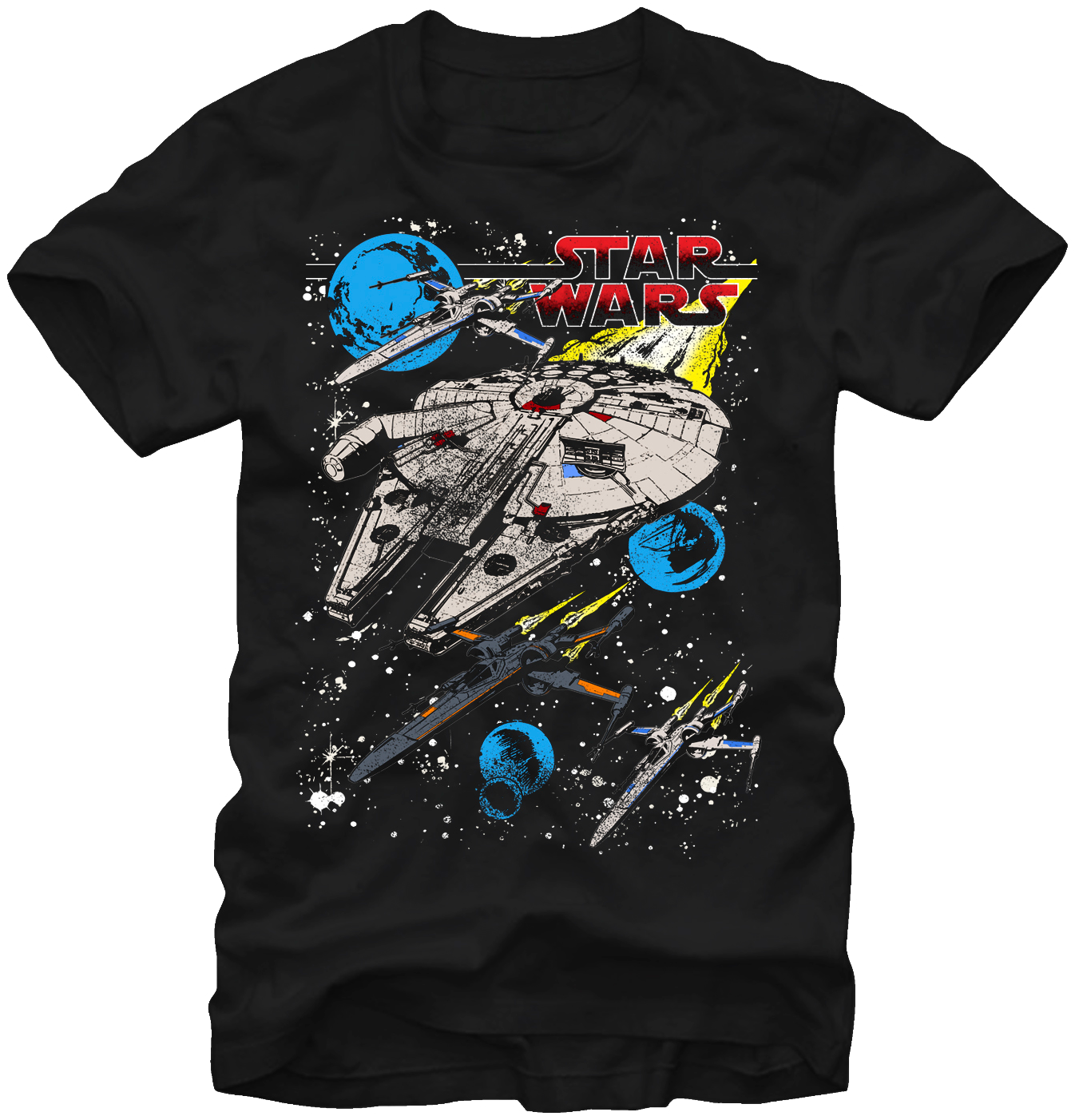 We all know which legendary ship can make the Kessel Run in less than twelve parsecs. The second coolest ship in the Star Wars universe, after the Millennium Falcon, is the T-65 X-Wing Fighter! Why? Because it has wings that open to increase the spread coverage of the laser cannons and it can also fire proton torpedoes and concussion missiles, which are great for strafing dens of Womp Rats. Both of these amazing starfighters are shown on this shirt with planets and stars in the background and the movie franchise's logo.