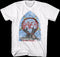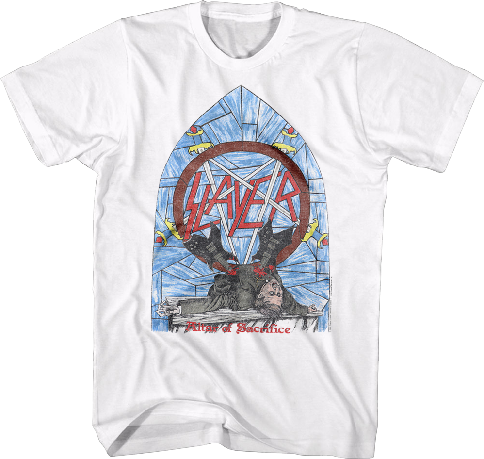 This Slayer t-shirt shows a man laid on a altar stabbed with electric guitars. The shirt includes the title of the song "Altar of Sacrifice".