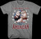 This Popeye t-shirt features an image of the popular sailor man posing in front of an American flag, flexing and showing off his tattoo of Old Glory on his bicep. The shirt reads I Y'am What I Y'am 100% American.