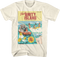 This Jaws t-shirt features the cover artwork for a brochure that shows tourists what they can expect in Amity Island. The artwork shows swimmers close to a great white shark's dorsal fin and fun boat tours aboard the Orca.
