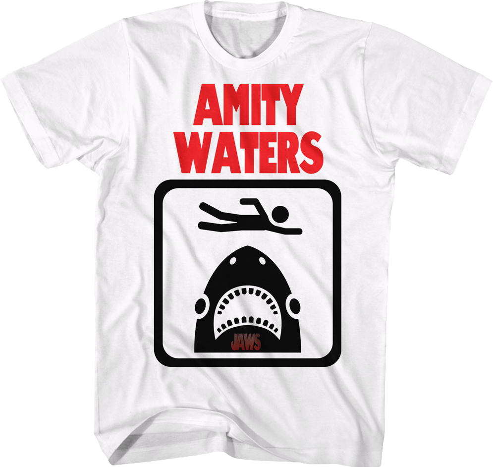 This Jaws t-shirt features a sign that shows a shark moving towards a swimmer. The shirt reads Amity Waters.