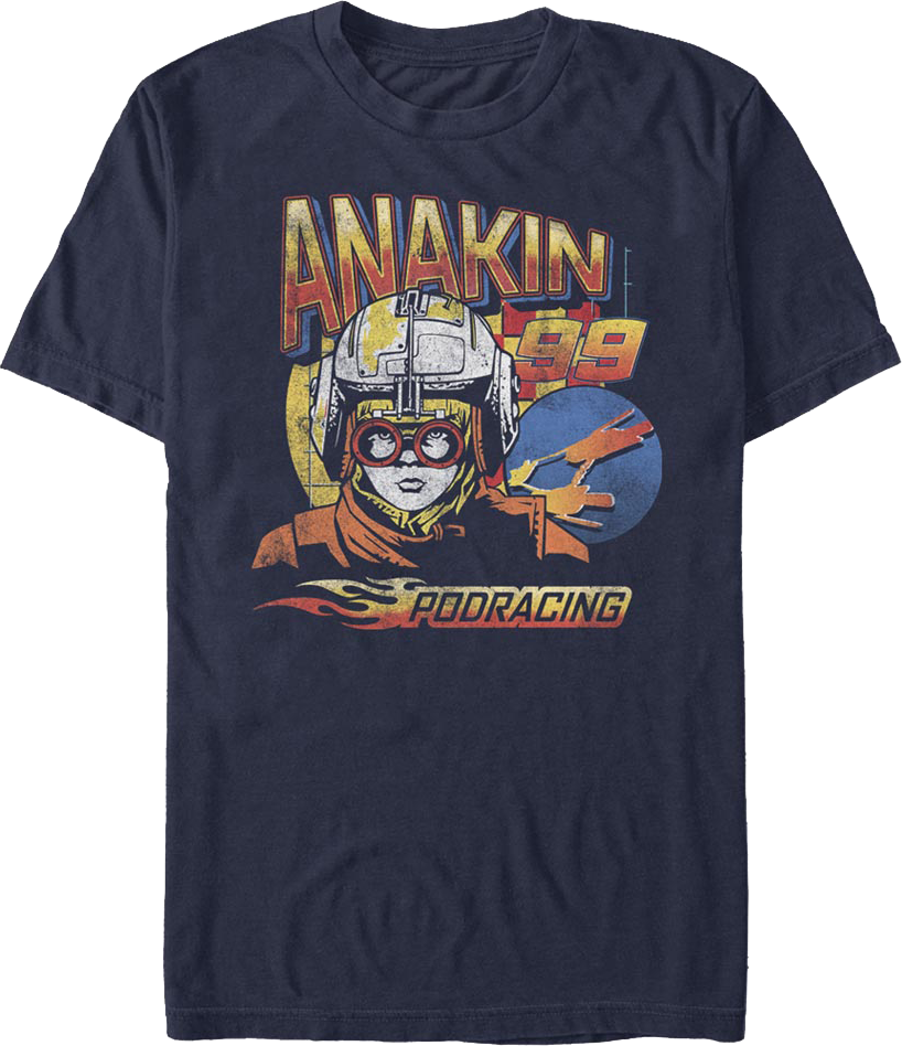 This Star Wars t-shirt shows young Anakin Skywalker ready to enter a podrace with a NASCAR-style checkered flag and racing number 99.