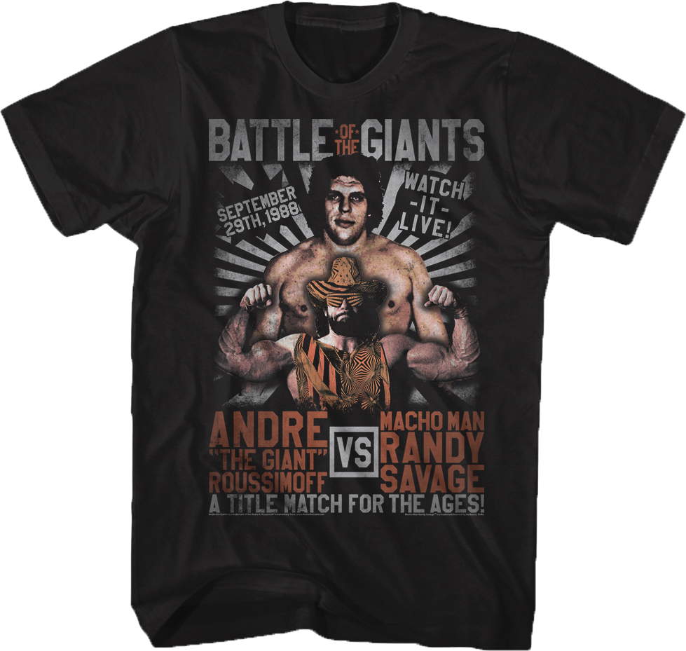 This t-shirt shows a promotional image for the Battle of the Giants. On September 29th, 1988 Heavyweight champion "Macho Man" Randy Savage defended his title against Andre The Giant at Madison Square Garden. This was truly a title match for the ages!