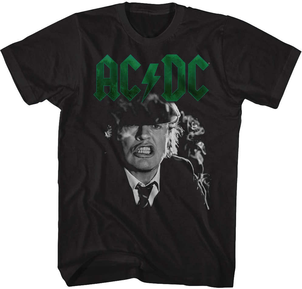 This Angus Young ACDC T-Shirt features a black and white portrait of the band's lead guitarist, co-founder, songwriter and the only constant original member. The shirt also shows the band's name in green letters. We have Angus to thank for the songs "Highway to Hell", "Back in Black", and "Thunderstruck" among others.