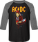 This AC/DC raglan baseball shirt shows the band's logo and Angus Young tearing through the shirt with blood dripping from his guitar.