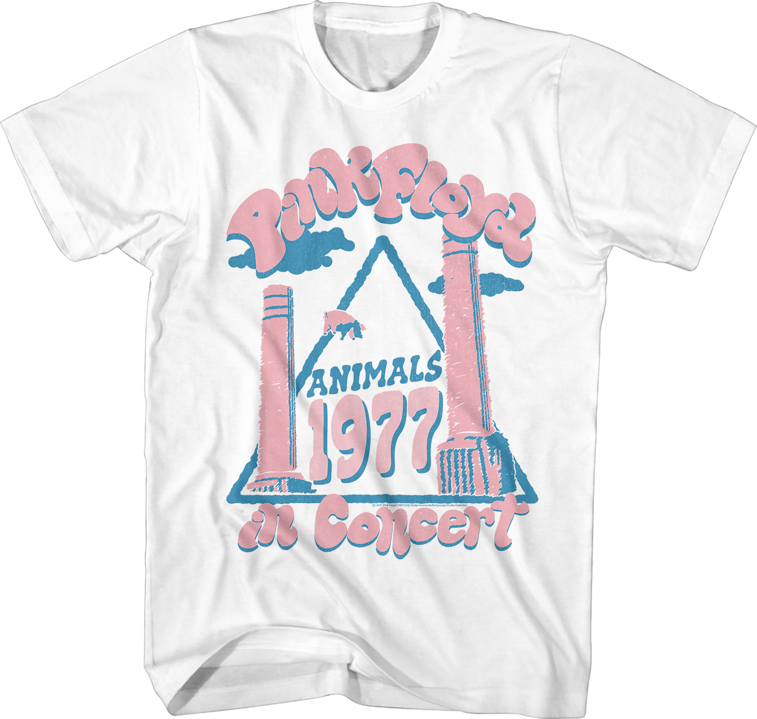 This Pink Floyd t-shirt features an illustrated image of the cover art for the band's tenth studio album, Animals. The artwork shows a pig floating between two chimneys of a power plant. After releasing the landmark album, Pink Floyd hit the road for a world tour with a set list that included "Pigs On The Wing", "Dogs" and "Sheep". Let everyone know that you are a fan of the legendary band with this Animals Concert Pink Floyd T-Shirt.