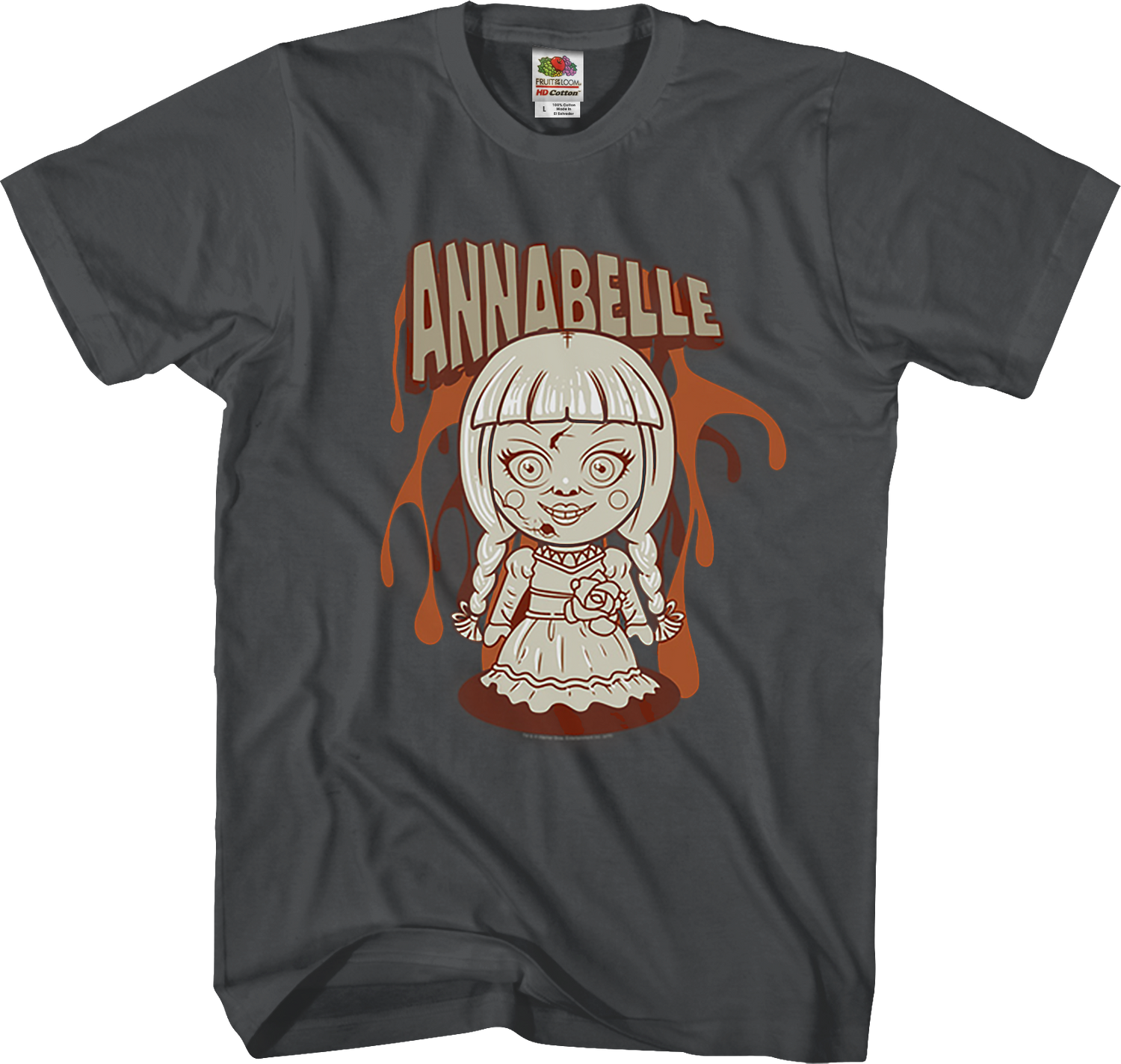 This t-shirt features an animated image of Annabelle, the doll that Ed and Lorraine Warren investigated in the 2013 movie The Conjuring.