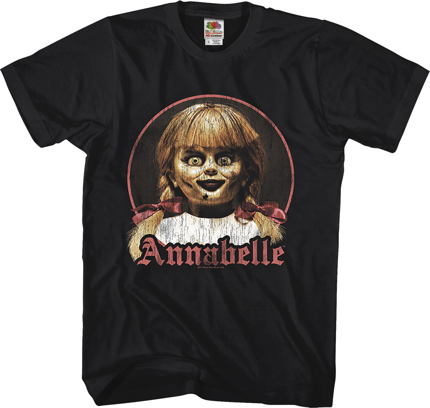 This Conjuring t-shirt features an image of Annabelle, the doll that Ed and Lorraine Warren investigated after two nurses gave a demon permission to enter the doll.