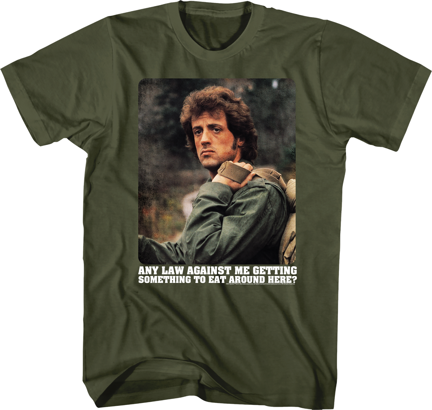 For any fan of the 1982 classic starring Sylvester Stallone, Richard Crenna and Brian Dennehy, this Any Law Against Me Getting Something To Eat Rambo T-Shirt is a must have!