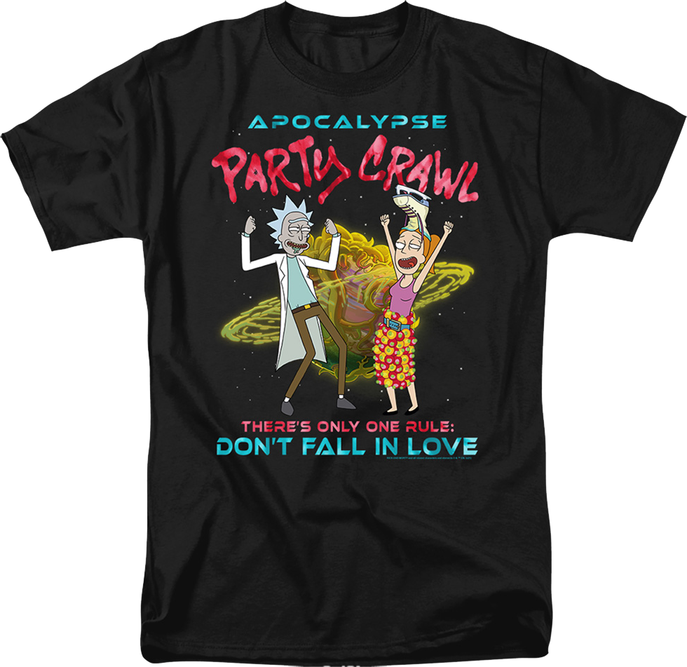 This Rick And Morty t-shirt shows Rick partying with his granddaughter, Summer. The shirt reads "Apocalypse Party Crawl. There's Only One Rule: Don't Fall In Love."