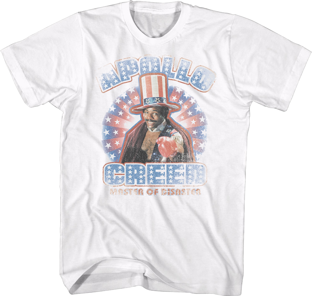 This Rocky t-shirt features an image of Apollo Creed wearing the patriotic outfit that he wore in the first Rocky movie. The shirt includes Apollo's nickname, Master Of Disaster.