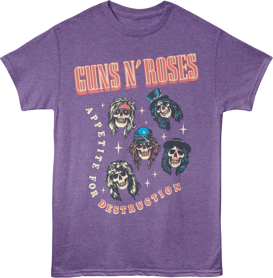 This Guns N' Roses t-shirt features the skulls of band members Duff McKagen, Slash, Axl Rose, Izzy Stradlin, and Steven Adler. The shirt includes the title of the hit album Appetite For Destruction.