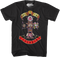 This 80sTees.com exclusive t-shirt features the Rock-afire Explosion, the animatronic band that played in ShowBiz Pizza Place restaurants from 1980 to 1990. Rock-afire Explosion appear on this t-shirt re-enacting the cover artwork for the Guns N' Roses album Appetite For Destruction.