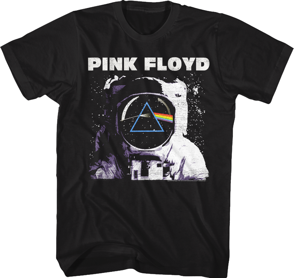 This Pink Floyd t-shirt shows an astronaut in outer space. The astronaut's helmet shows the reflection of the colorful prism that appears as the cover artwork for Pink Floyd's album The Dark Side Of The Moon.