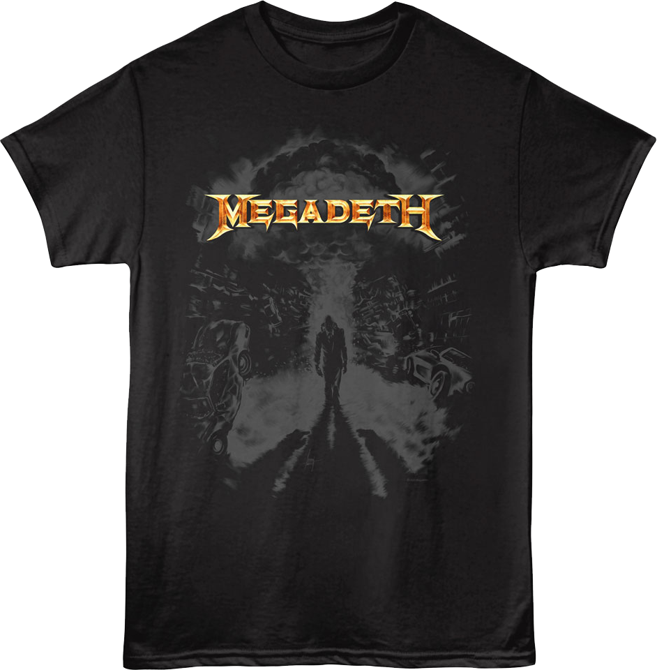 This Megadeth t-shirt shows the band's mascot, Vic Rattlehead walking through the aftermath of an atomic bomb.