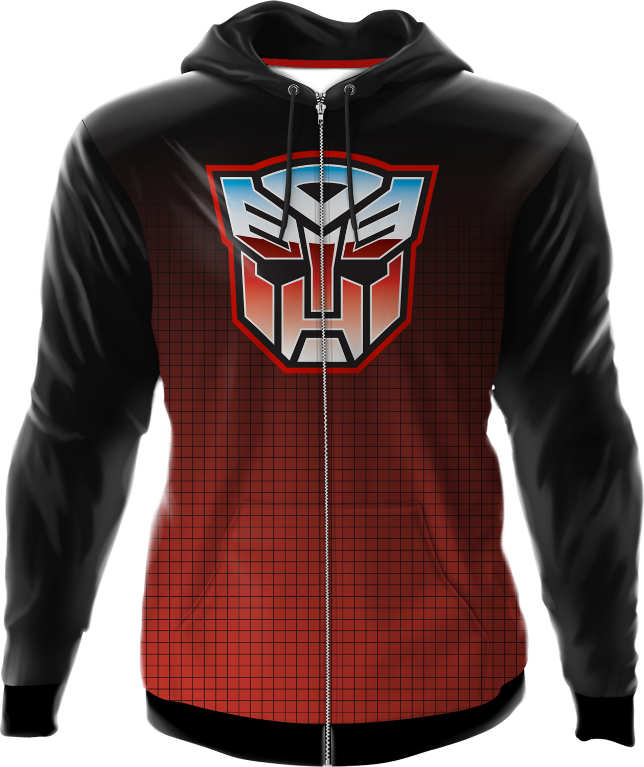 As a member of the first Generation of our line of Exclusive Premium Activewear with our Icon Fade design concept, it's fitting that this Autobot Transformers Zippered Hooded Jacket features the grid pattern that every fan of the first Generation of Transformers remembers so fondly.