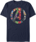 This Avengers t-shirt shows the six most popular superheroes from the team assembled in the Avengers logo. The heroes include Captain America, Black Widow, the Incredible Hulk, Iron Man, Black Panther, and Thor.