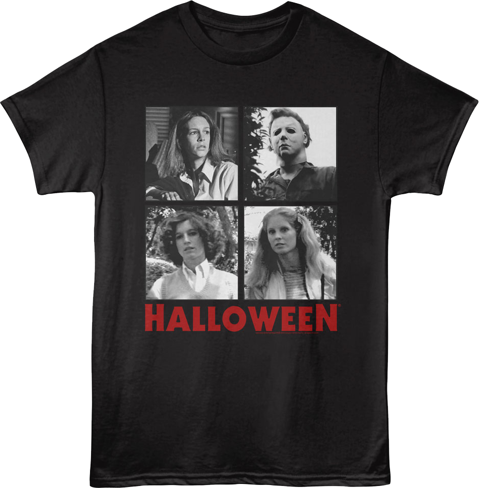 This Halloween t-shirt features black and white images of Laurie Strode, Michael Myers, Annie Brackett, and Lynda von der Klok.