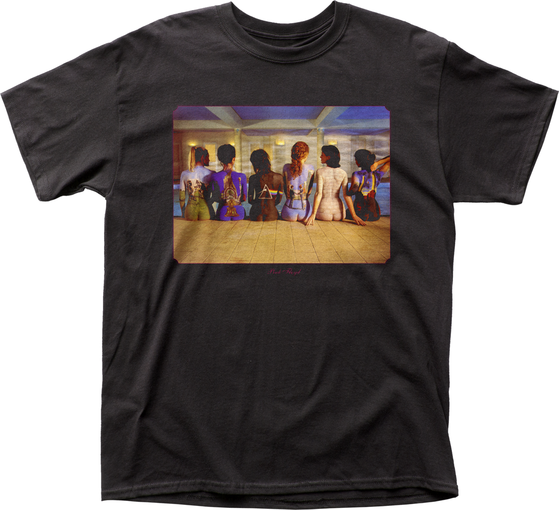 This Back Catalogue Pink Floyd T-Shirt features the famous picture of female models displaying six album covers painted on their backs while sitting poolside. The albums displayed are: Atom Heart Mother, Relics, Dark Side Of The Moon, Wish You Were Here, The Wall, and Animals.