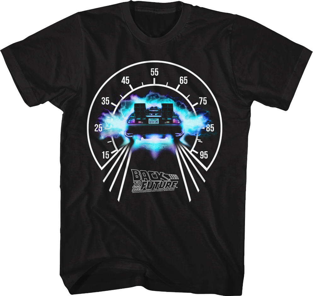 This is heavy. This Back To The Future t-shirt shows Emmett Brown's DeLorean traveling through a speedometer. In the 1985 classic Back To The Future, Doc Brown knew that when his DeLorean hit 88 miles per hour, it would end up on a serious shirt. Now, you can show that you are a fan of the most thrilling time traveling adventure of all time with this Back To The Future Speedometer t-shirt. Even if you're not ready for this Back To The Future Speedometer shirt yet, your kids are going to love it!