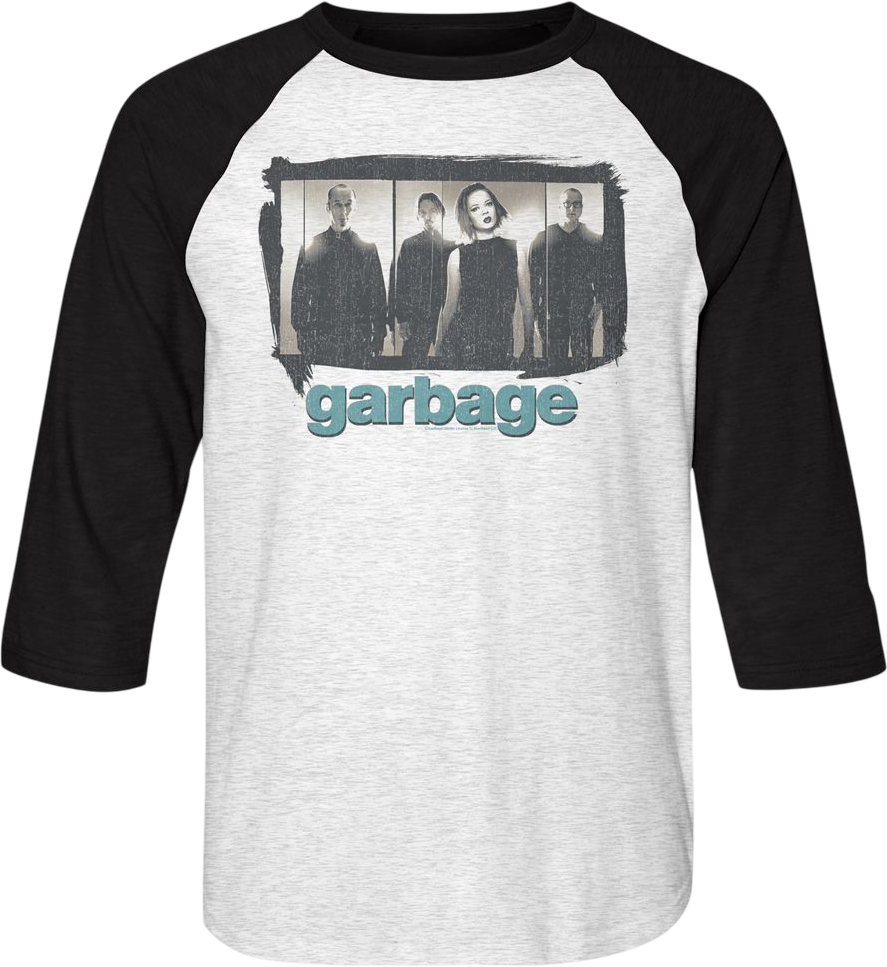 Headed by frontwoman Shirley Manson, alternative quartet Garbage debuted in the 90s with a guitar-based, electronic-washed sound on the hits "Only Happy When It Rains", "Stupid Girl" and "Milk". Let everyone know you are a fan with this Band Photo Garbage Raglan Baseball Shirt!