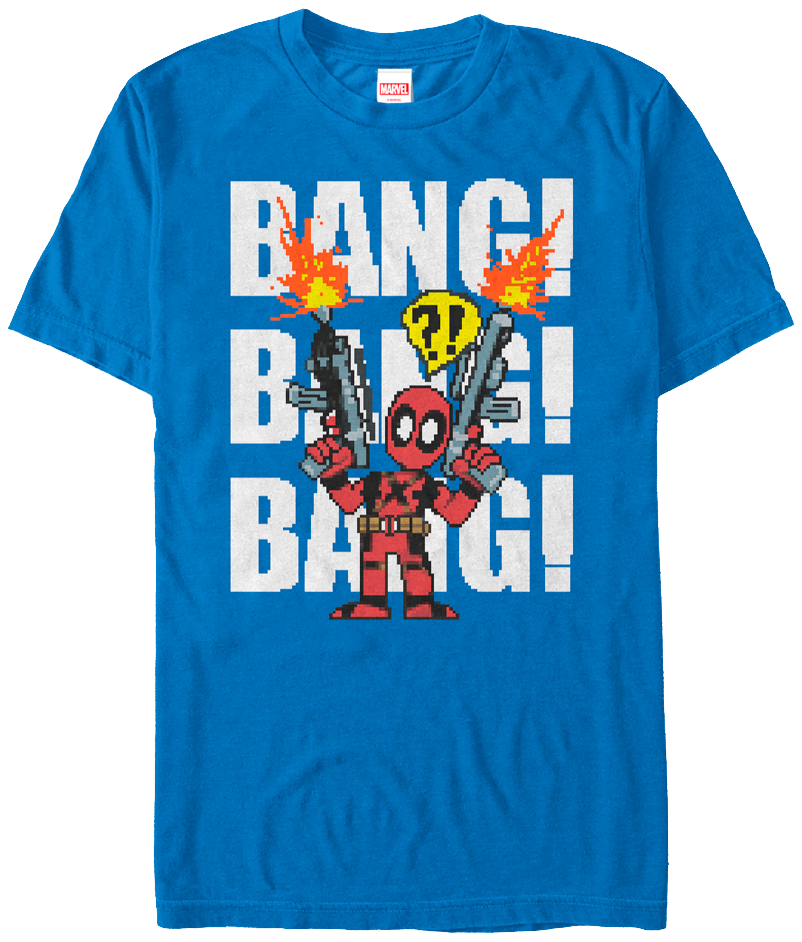 For any fan of the Weapon X Program's favorite creation, this Bang Bang Bang Deadpool T-Shirt is a must have.