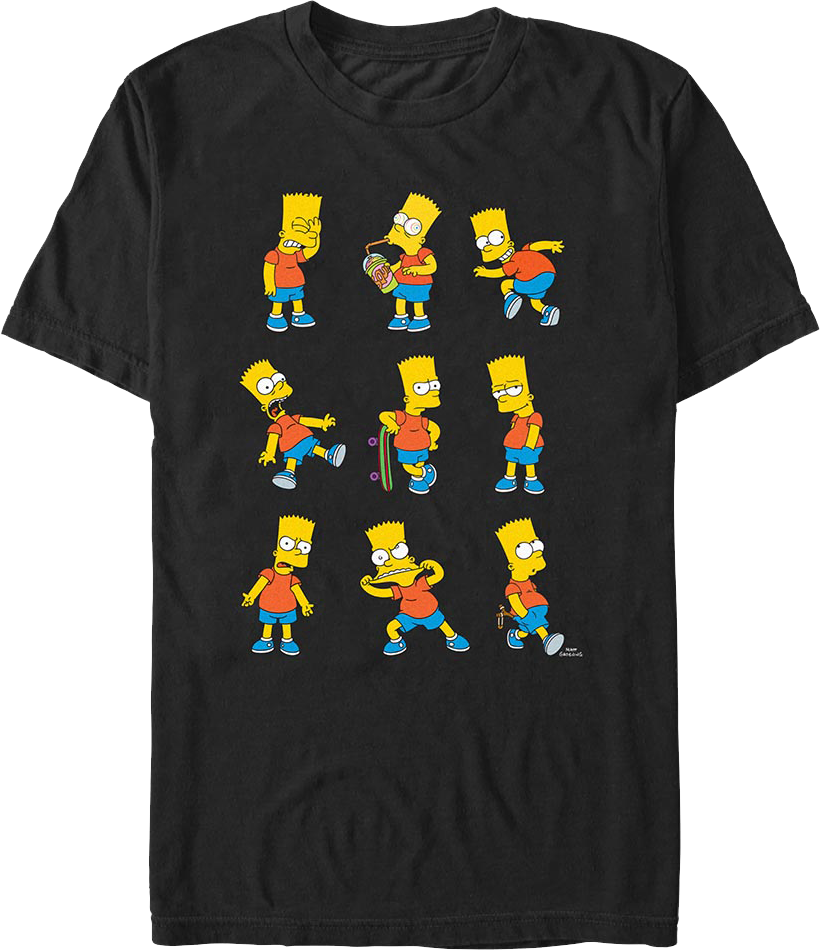 When the Simpsons premiered, Bart Simpson became one of television's most popular characters, and he started a cultural phenomenon known as "Bartmania". Throughout the Simpsons' run, Bart has proven to be a rebel who's also a good kid, a terror who's easily terrorized, and a mischievous character that is relatable with fans. Show your love for the hilarious character with this Bart Simpson Poses Simpsons T-Shirt!