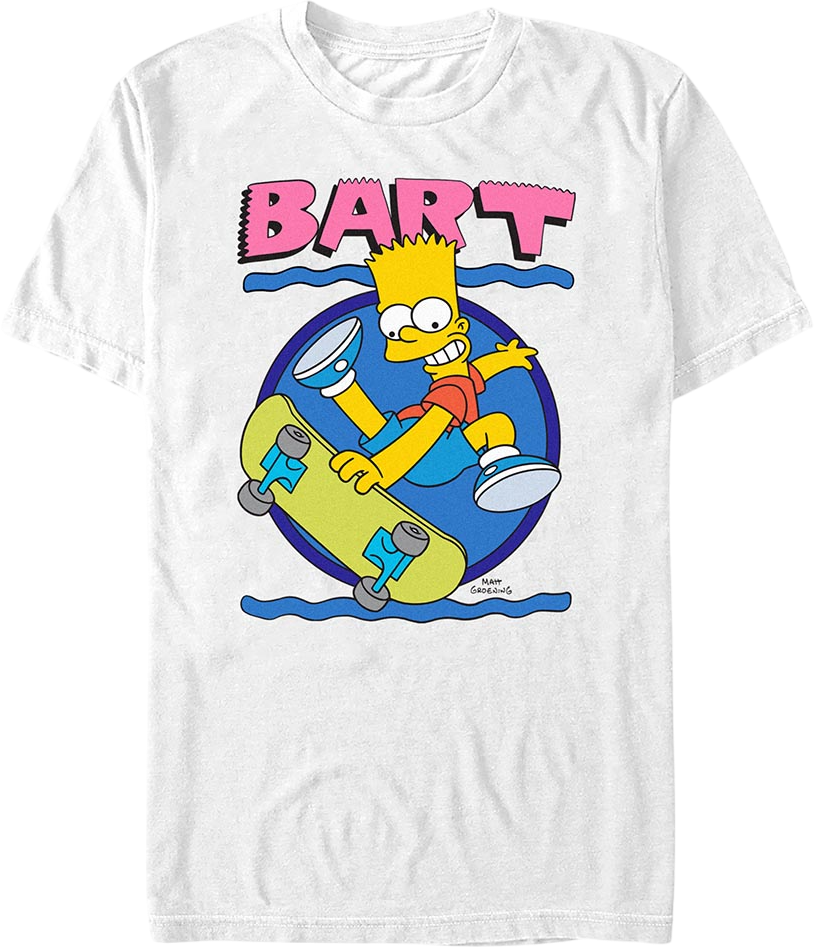 Bart Simpson embodies the classic mischievous kid. He is defiant of authority, full of pranks, and ready to perform daredevil stunts on his skateboard. Bart is one of the greatest animated characters in television history, and everyone will instantly know you are a fan when you wear this Bart Simpson Skateboard Simpsons T-Shirt!