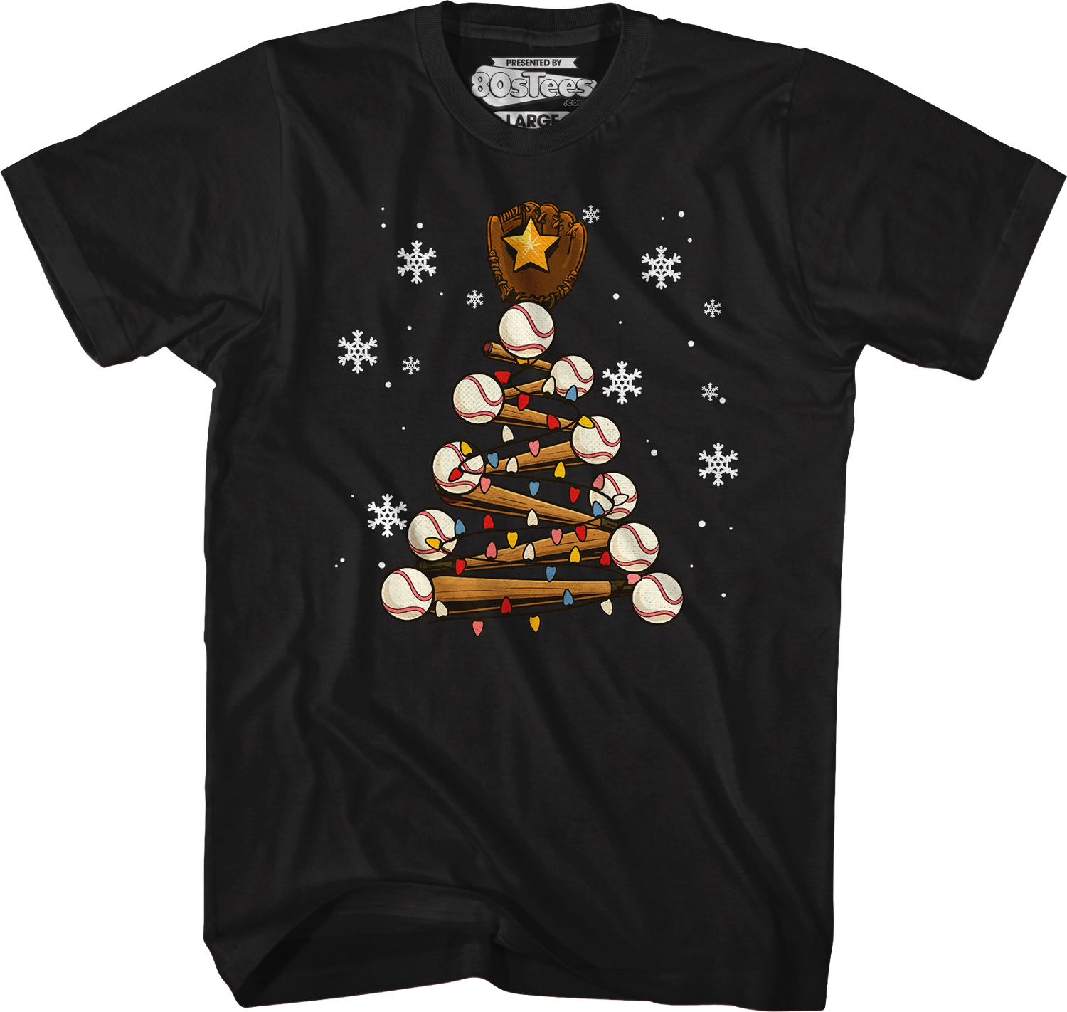 This 80sTees.com exclusive t-shirt shows snowflakes surrounded a Christmas tree made with baseballs, baseball bats, a baseball glove and Christmas lights.