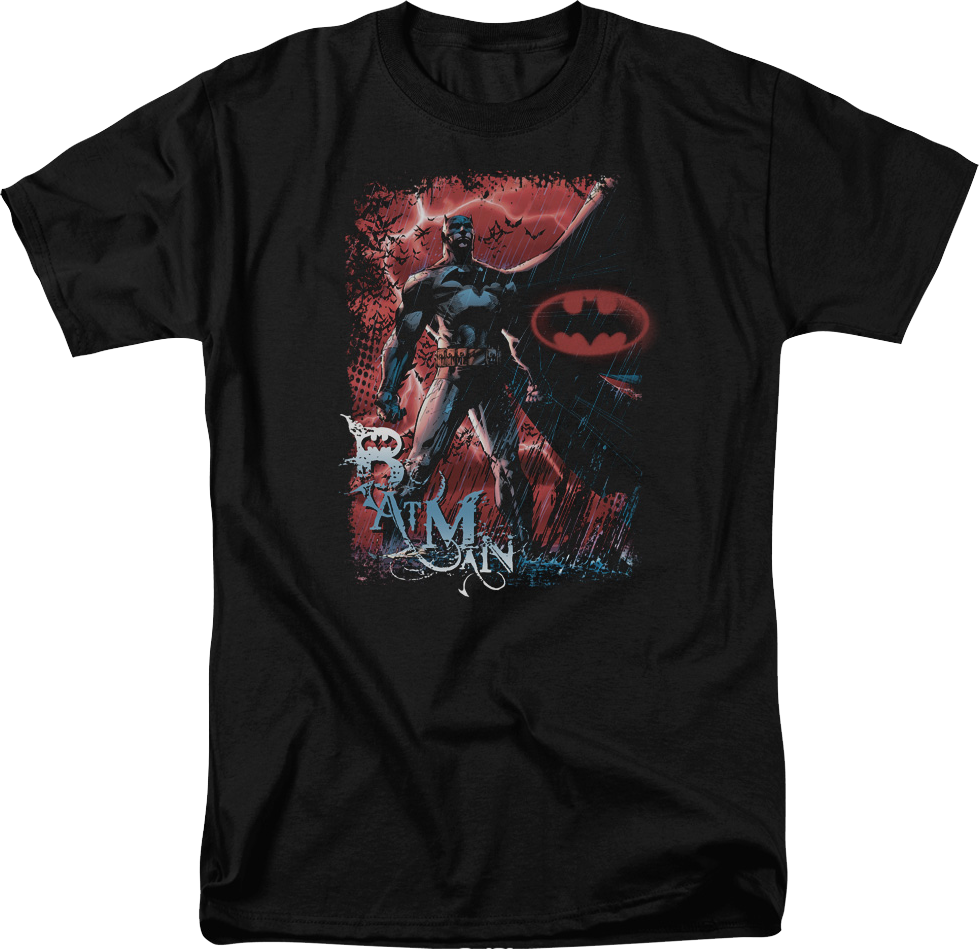 This Batman t-shirt shows the Caped Crusader standing tall in a lightning storm as the protector of Gotham City.